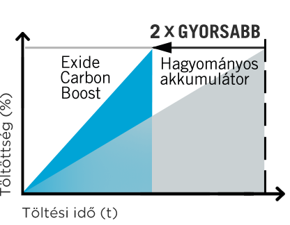 Az Exide Carbon Boost technológiájával nagyjából kétszer gyorsabb töltési idő érhető el a hagyományos akkumulátorokkal szemben, ami a nagyvárosi autóhasználat esetén különösen előnyös lehet.